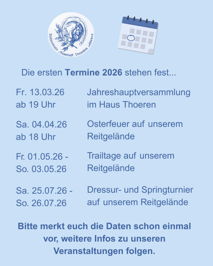 Termine 2026 Beitrags-Autor:admin Beitrag veröffentlicht:Dezember 15, 2025 Weitere Events sind in Planung und werden bald bekannt gegeben. Weitere Artikel ansehen Vorheriger BeitragFrohe Weihnachten Das könnte dir auch gefallen Adventsmarkt 2025 – Wir waren dabei 🎅 Oktober 29, 2025 Weihnachtsfeier – schön war es🎄 Oktober 19, 2025 Sommerturnier 2025 Mai 20, 2025
